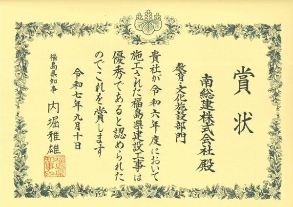 令和7年9月10日、当社は福島県知事より『教育・文化施設部門』において、「令和7年度福島県優良建設工事表彰」を受賞いたしました。